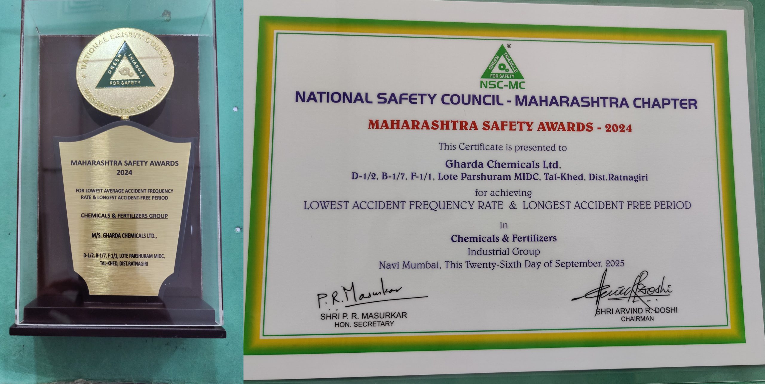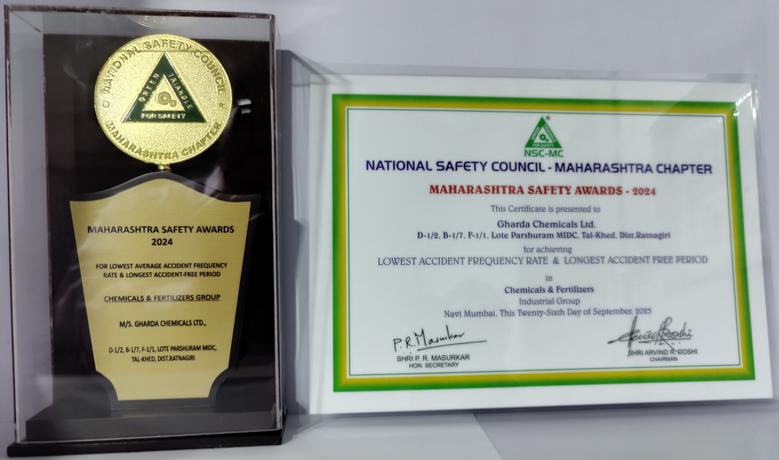 Gharda Chemicals Limited – Lote Unit has been recognized by the National Safety Council, Maharashtra Chapter under the Chemicals & Fertilizers Group for outstanding safety performance.